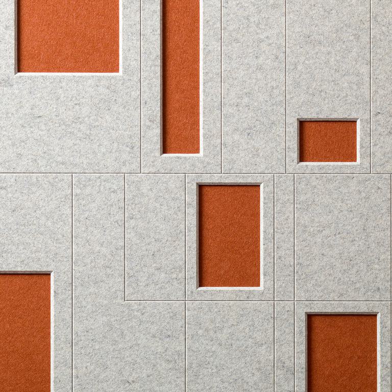 This double-layer panel of cutout rectangular windows is an upbeat play on architectural fenestration, as well as a backdrop that reduces excessive noise. Beveled edges give the rectangles on the top layer added dimension, complemented by engraved horizontal and vertical lines that surround the cutouts. Windows, which has an NRC rating of 0.45, promotes auditory comfort in style.